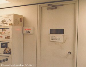 The door leading into "8A". It had a window so that, hopefully, visitors would look in before just opening the door and going in. The sign below it indicated this. The door was very heavy. You had to give it a good push to get through and when it closed it felt like you were being "sealed in". The idea, of course, was to eliminate outside noise inside the studio. There was a special "smell" to the place and an energy you could feel as you entered. There was always the sound of music or somthing else going on. It was never boring. |