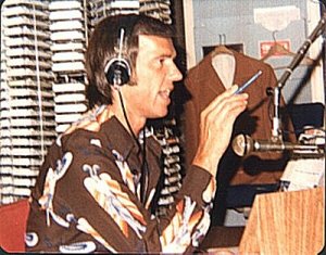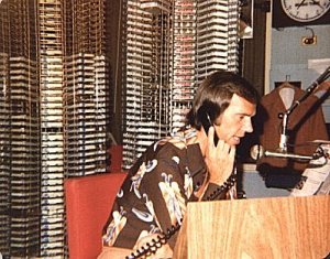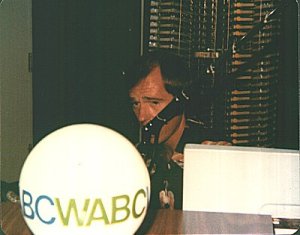 George Michael sitting in front of the WABC microphone. You can see a copy of "Billboard Magazine" to his left and more revolving cart racks with music behind him. George is reviewing the copy book for an upcoming telephone call in contest. His headset sits just in front of him. Very little was left to chance and George was careful to prepare for whatever was coming next. |