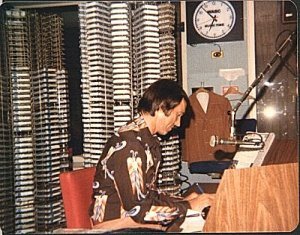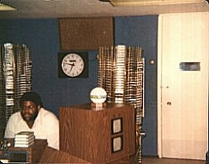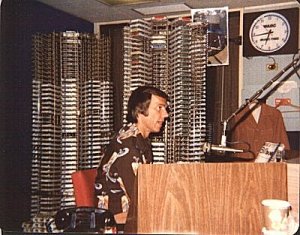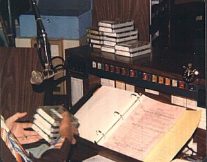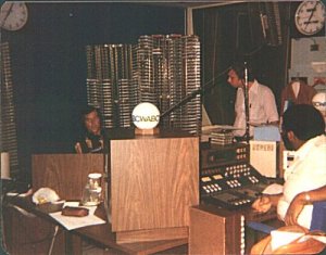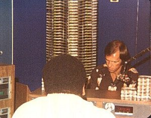 | The control board from the engineer's side, standing behind him to his right. George Michael, the disk jockey sits facing him on the other side of the console. (The person standing is a friend of mine who was visiting the studio with me). You can see the large number of controls, dials and meters the engineer manipulated. You can also see the horizontal digital clocks at the top of the console. These were for monitoring lengths of songs, commercials, jingles, song intros and almost everything else that was on the air. | From directly behind the engineer. On top of the console are carts with music which George has placed for the for the engineer to play at the appropriate time. To the engineers left and right are "cart machines" which were the units that played back the music, commercials, and jingles. The racks behind the disk jockey contained the music identified by name, artist, length, intro time to vocal and a colored adhesive "dot" which indicated the category the song fit into (current hit, oldie etc.). |