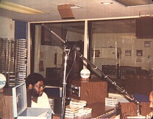 Standing just to the disk jockey's left (you can just see George Michael in front of the mic) you can see a glass window which separated the main studio (8A) from the production studio (8N) where the engineers recorded programs and network feeds. The transmitter controls were also in this room along with tape decks which could be controlled by the studio engineer. |