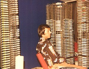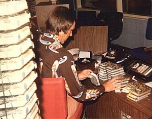 Taken from the opposite side of this table. George sits back and spins the racks of music around to find the songs he plans to play. Note the colored dots on the back of the carts indicating how each song fits into the WABC format. See the WABC format sheet. |
