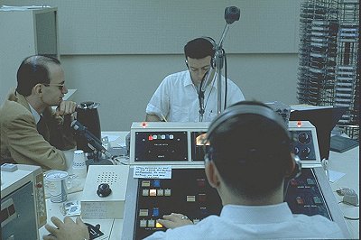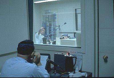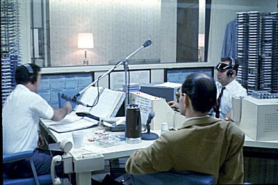 The set up of the air personality and the engineer in these pictures is very similar to what was used at 1330 (see the "Virtual Tour of the WABC studio" section). The disk jockey and engineer sat across from each other and were not separated by a glass wall. The tape racks were located in easy reach and the adjacent studios were used for news and production.