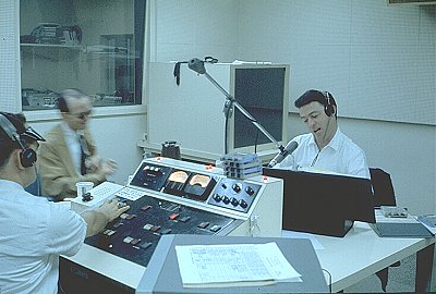Scott Muni at the microphone seated across from his engineer.