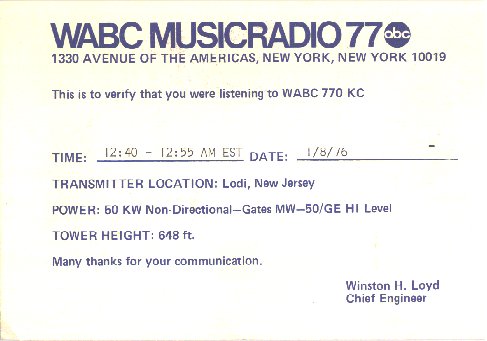 This WABC "QSL Card" is from 1976. I sent a letter to WABC reporting that I had listened to the station in Miami, Florida.